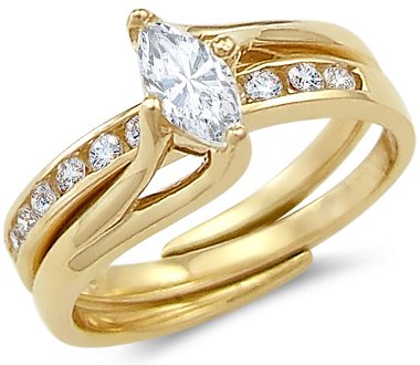 14k Yellow Gold Ladies Engagement Wedding Cubic Zirconia 2 Ring Set. This brand new ring has a dazzling high polish finish. Solid and Pure 14k Gold, NOT plated. Authenticated with a 14k stamp. This ring is absolutely stunning and we are confident you will love it. The size of the center stone is 0.5ct. , 8mm * 4mm. The stone shapes included in this ring are Round and Marquise.